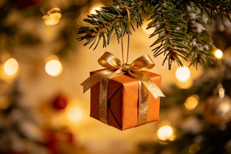 圣诞树上的金色礼盒装饰