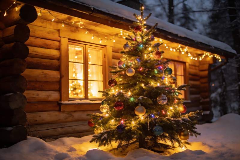 雪夜木屋前的圣诞树