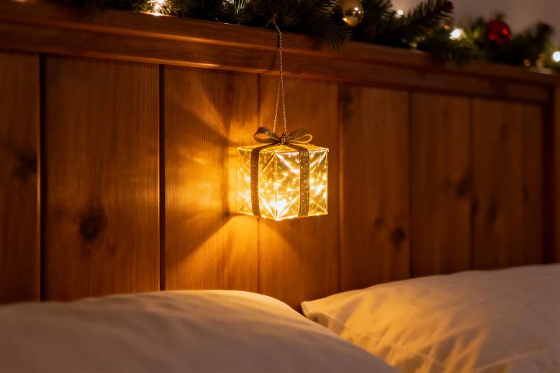 圣诞灯饰照亮木质床头