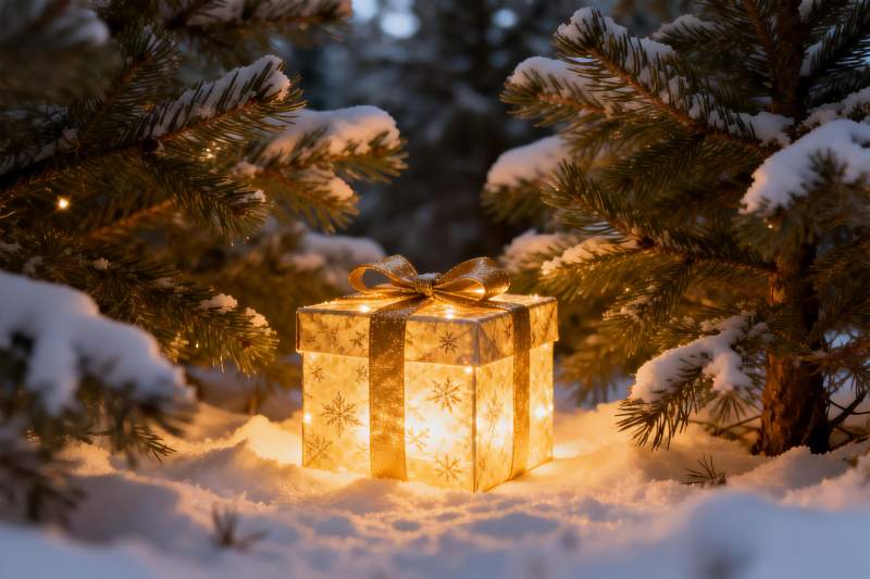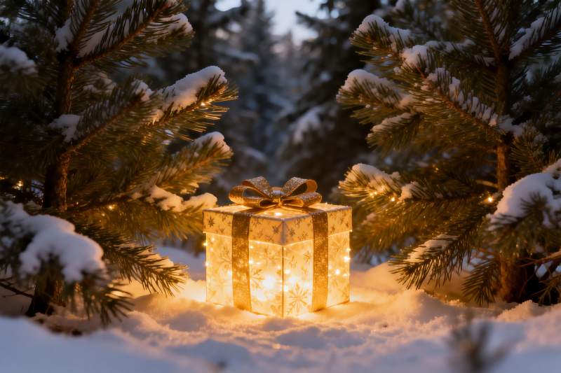 雪夜松林中的发光礼盒