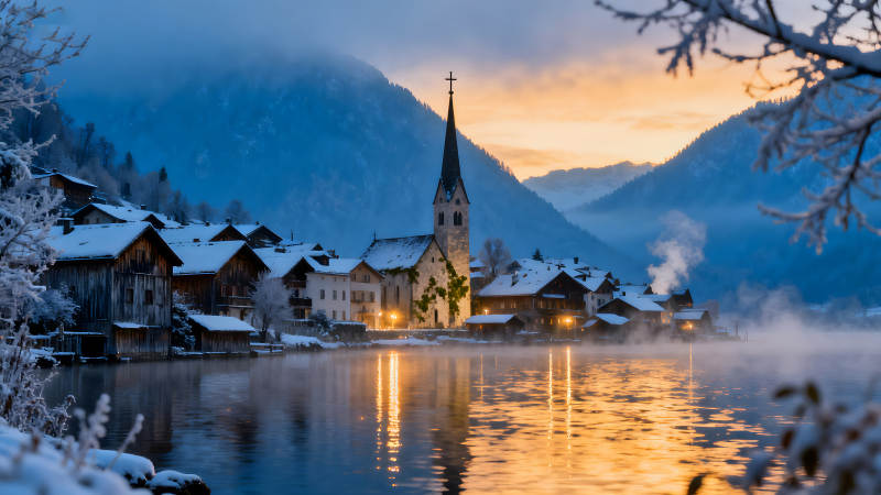 雪山小镇湖泊宁静冬日风光
