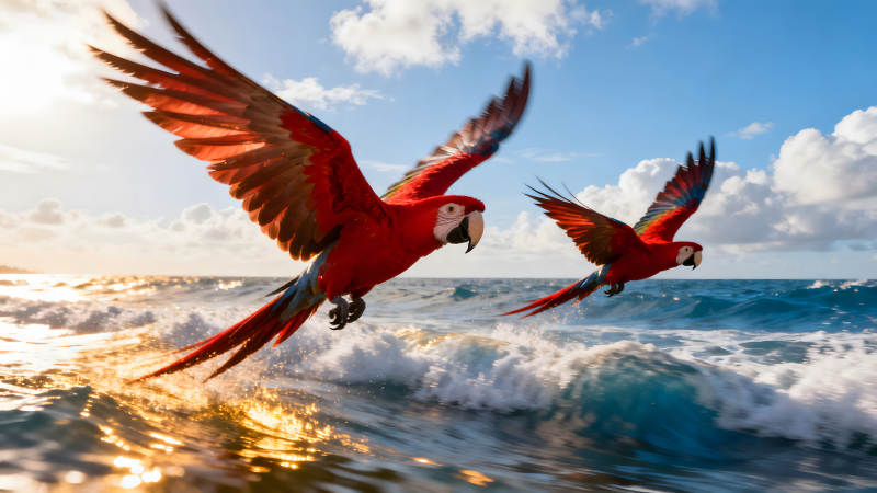 红鹦鹉飞翔海面景象