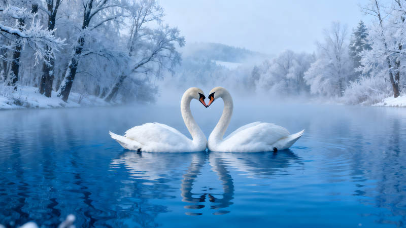 两只天鹅组成的心形冬日湖面
