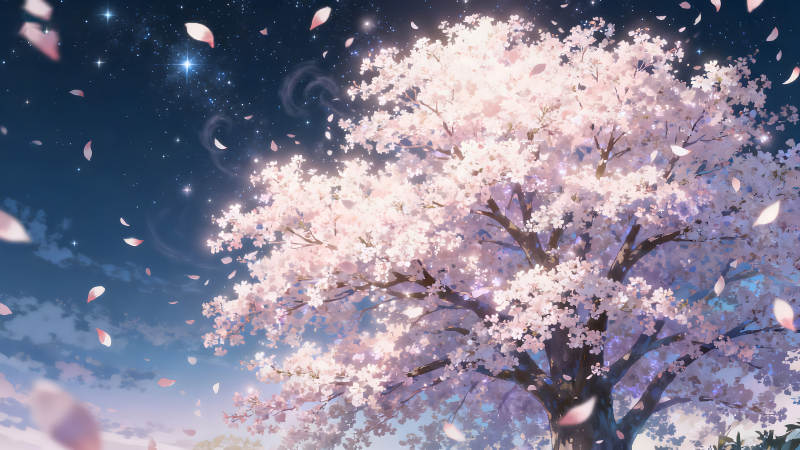 夜樱树下繁星点点粉色花瓣飞舞