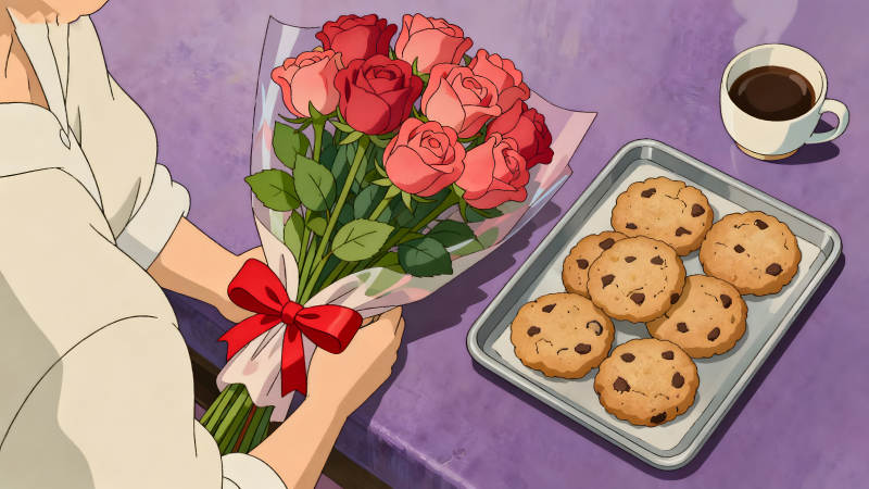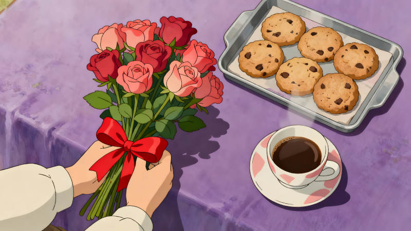 鲜花饼干咖啡的温馨画面