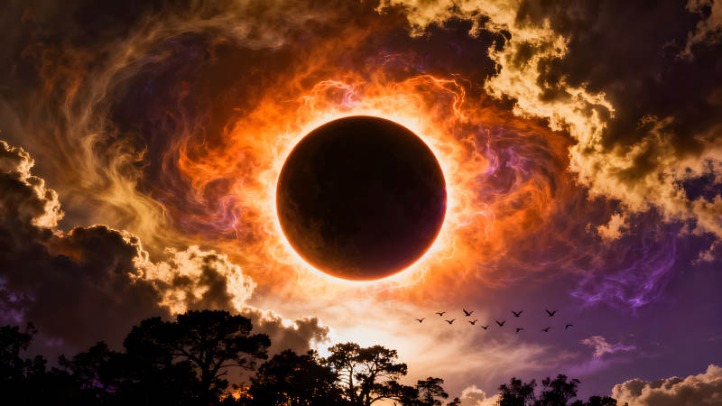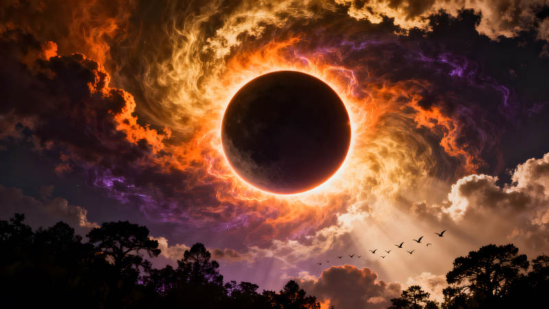 日食奇观鸟类飞翔树木剪影天空奇幻