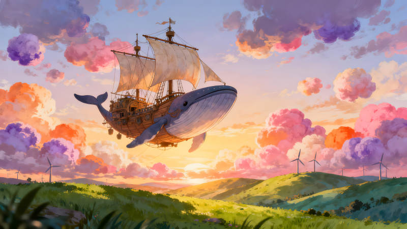 鲸鱼飞船翱翔天空景色梦幻唯美