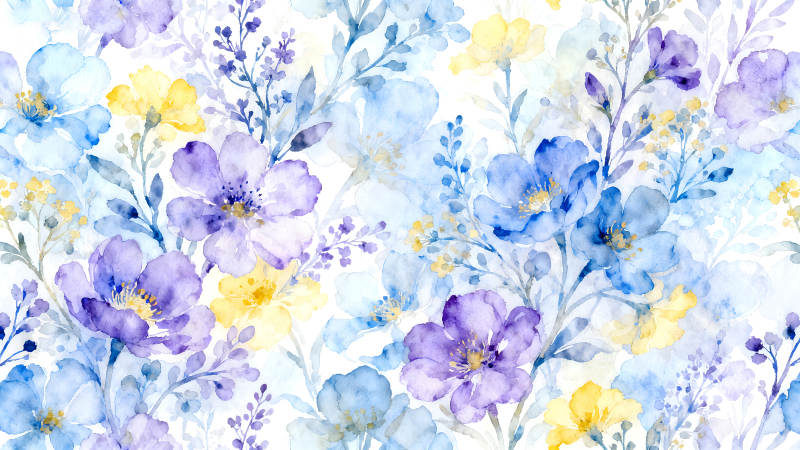 水彩花卉图案蓝色紫色黄色组合
