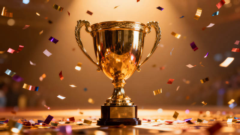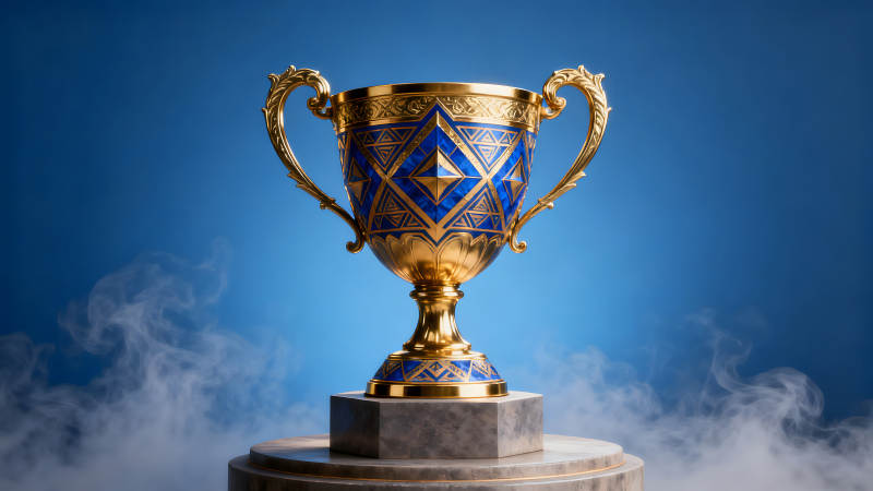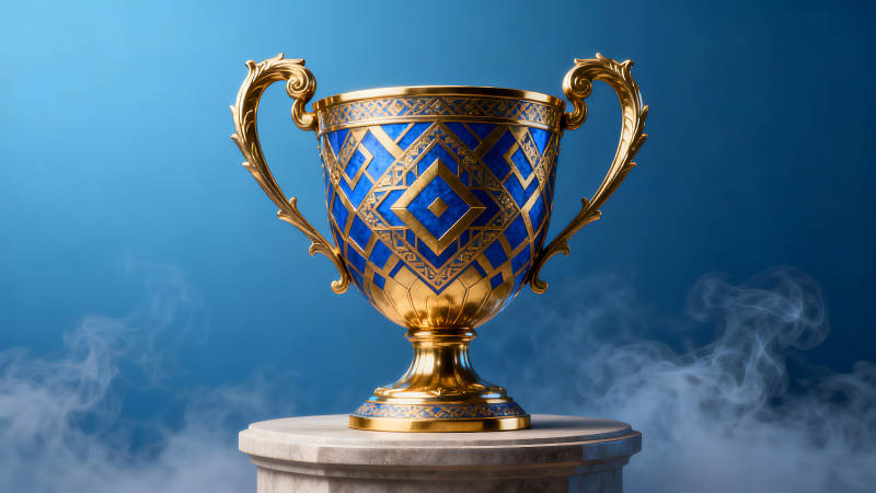 金色奖杯置于蓝色背景之上