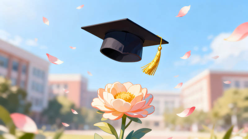 毕业季鲜花与学士帽飞舞