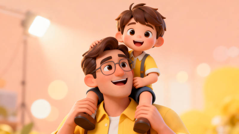 父亲背着孩子露出灿烂笑容