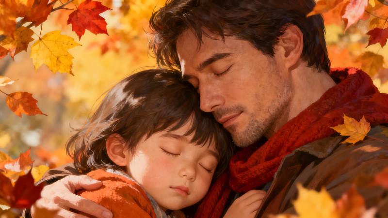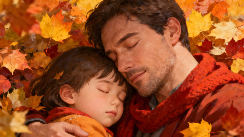 父子依偎在落叶中