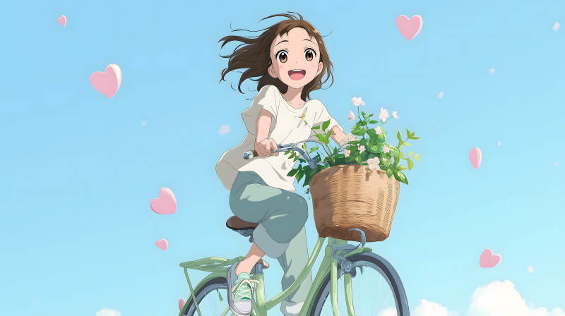 女孩骑车带着鲜花