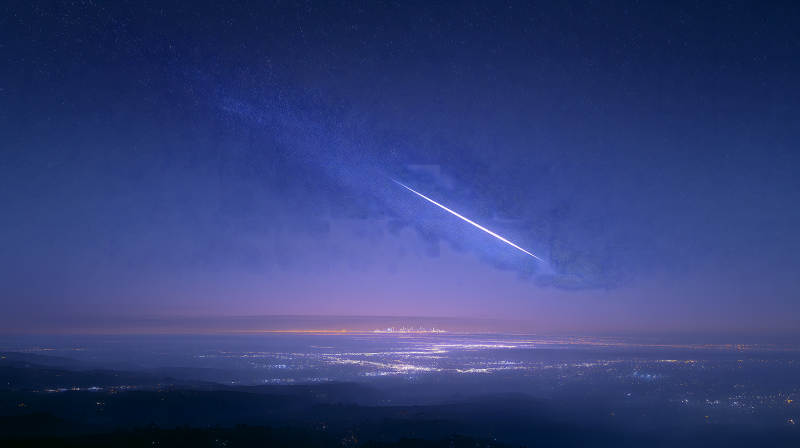 流星划过夜空城市灯光
