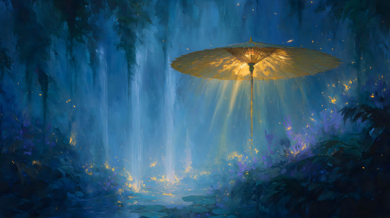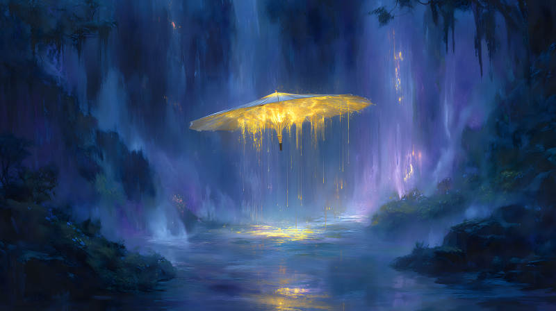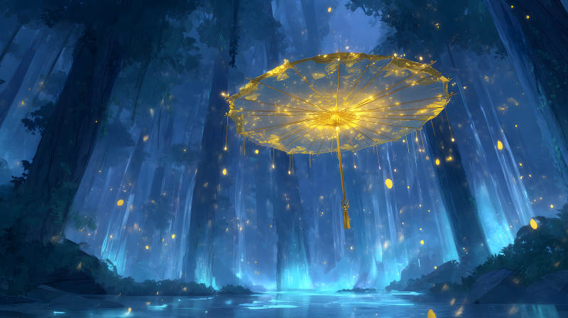 金色雨伞下的梦幻仙境