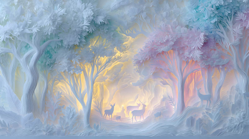 纸雕森林中的鹿群