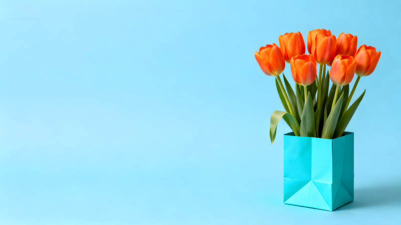 橙色郁金香插花蓝色背景简约风格