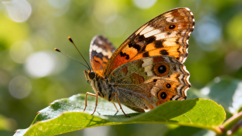 蝴蝶停在绿叶上翅膀花纹色彩鲜艳