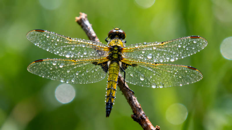 一只沾满水珠的蜻蜓停在树枝上