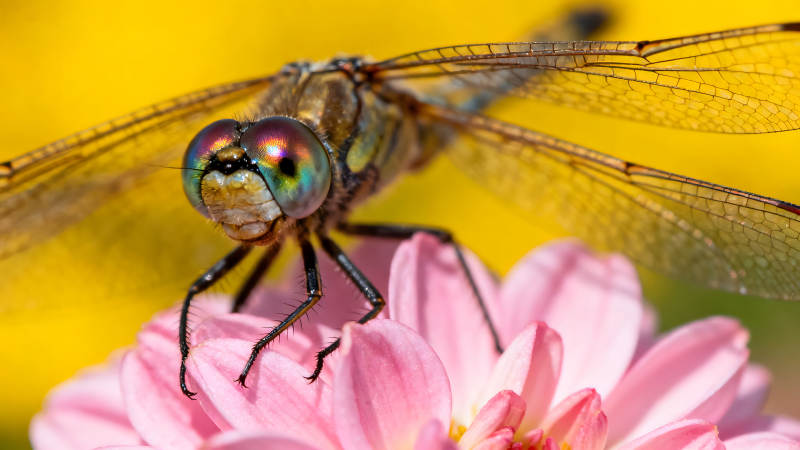 蜻蜓停在粉色花朵上背景是黄色