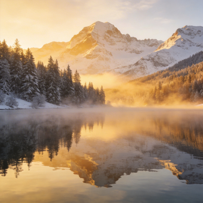 雪峰晨雾映湖光