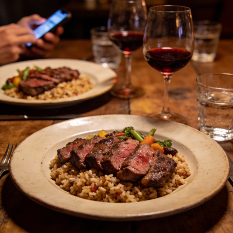 红酒配牛排晚餐