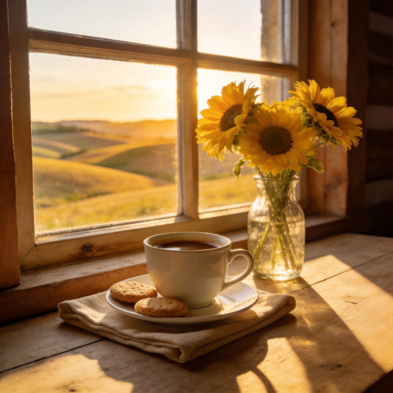 窗边咖啡与向日葵