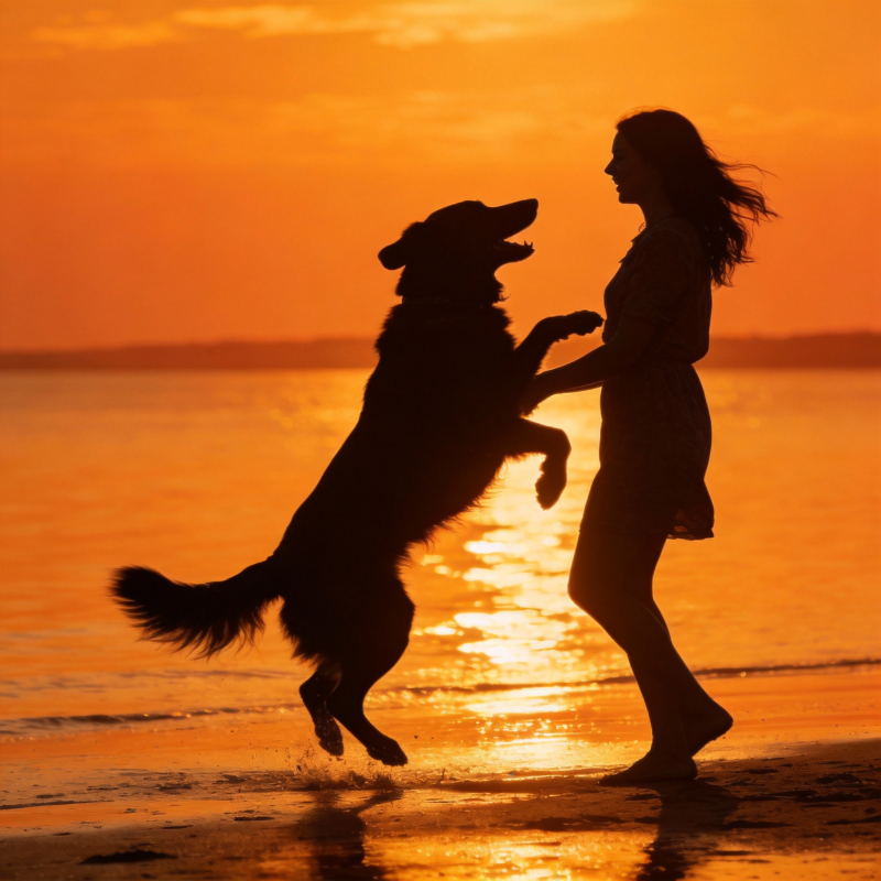 夕阳下人狗嬉戏