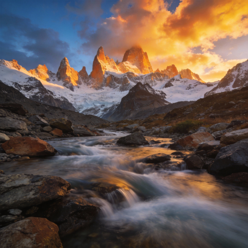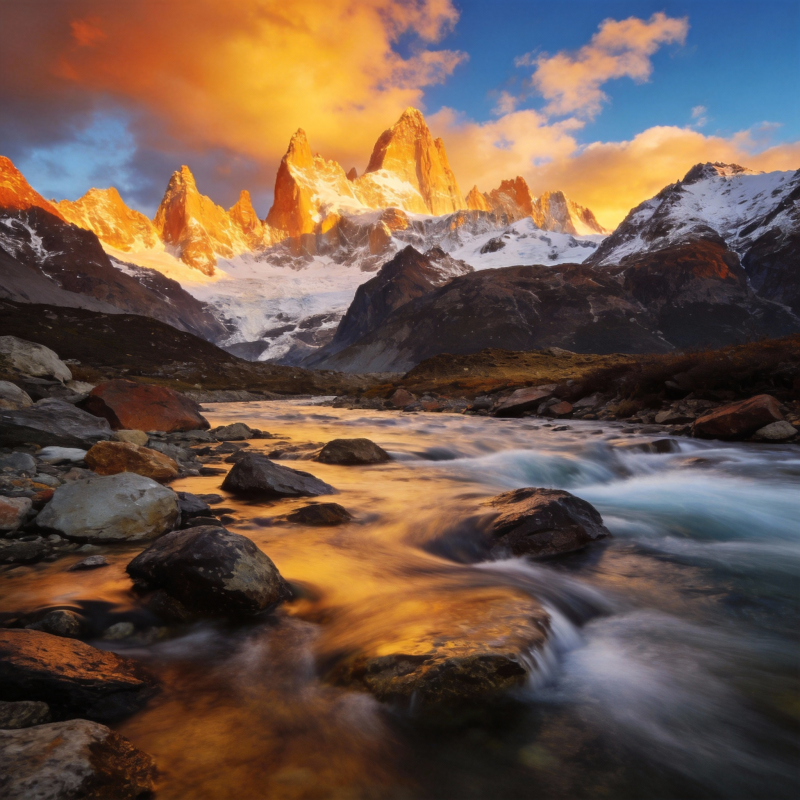 雪山日落溪流