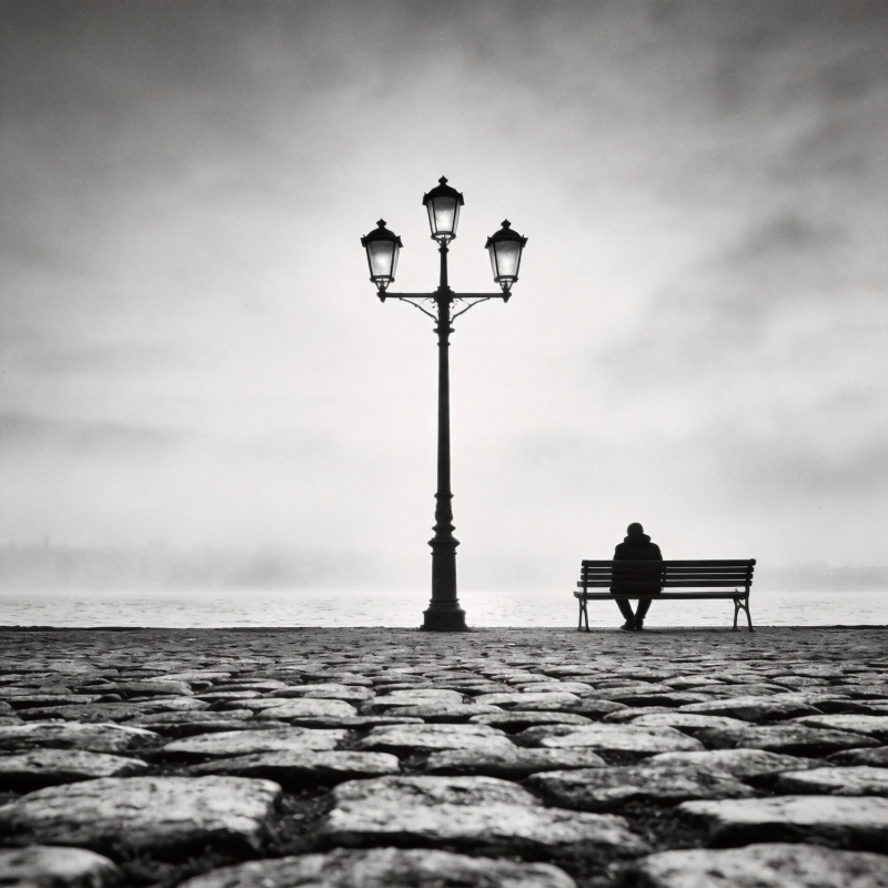 孤影静坐长街灯下