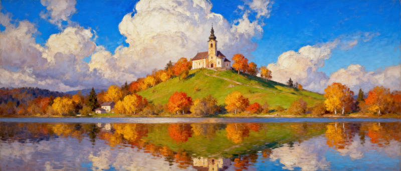 秋色湖光倒影