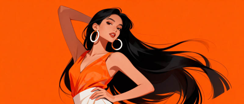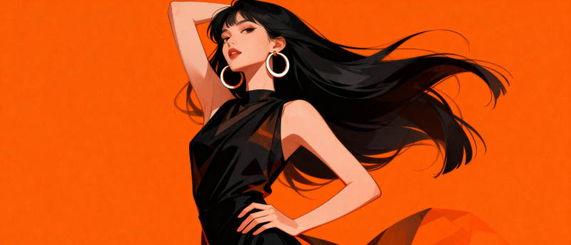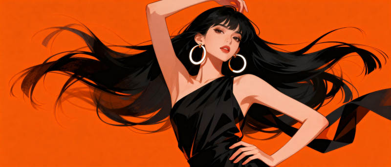黑发美人舞动橙色背景