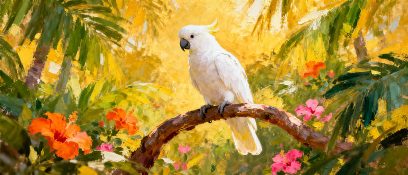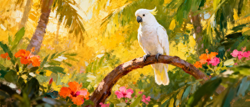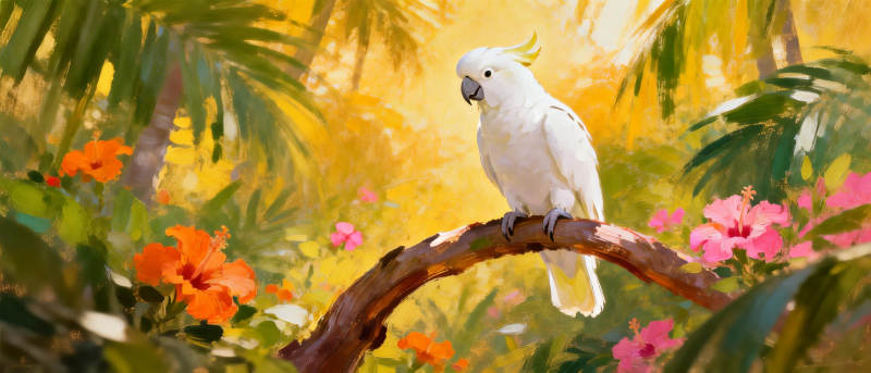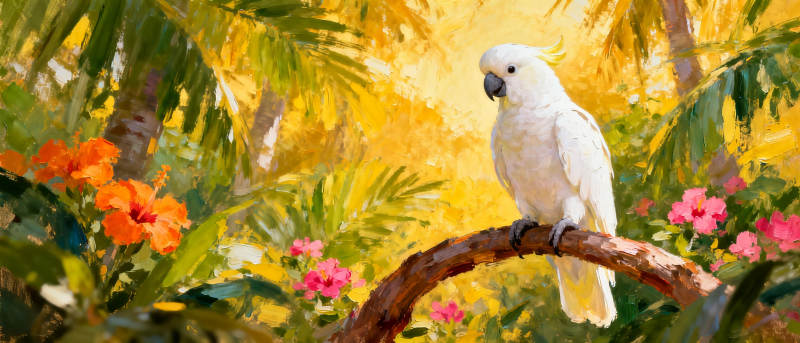 白鹦鹉栖枝花丛中