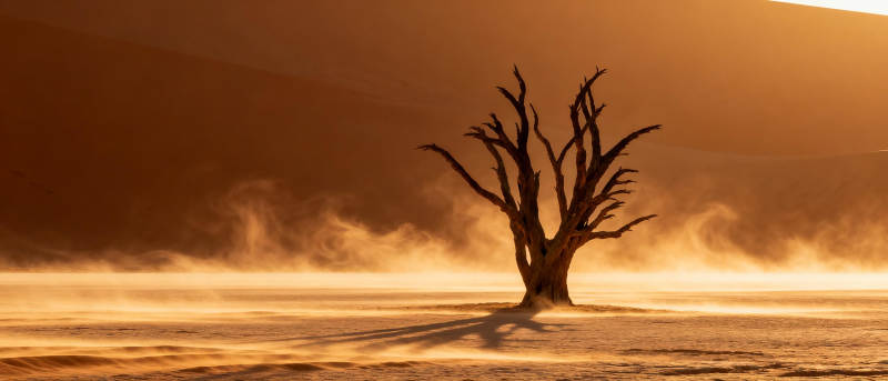 孤树沙海晨雾
