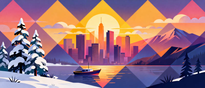 雪景都市日落图