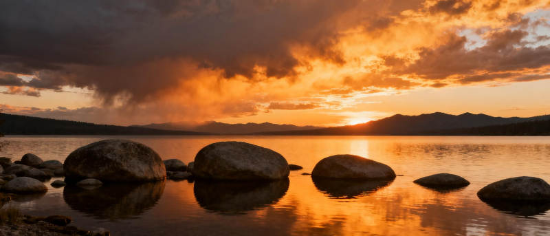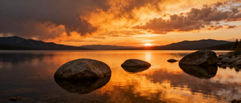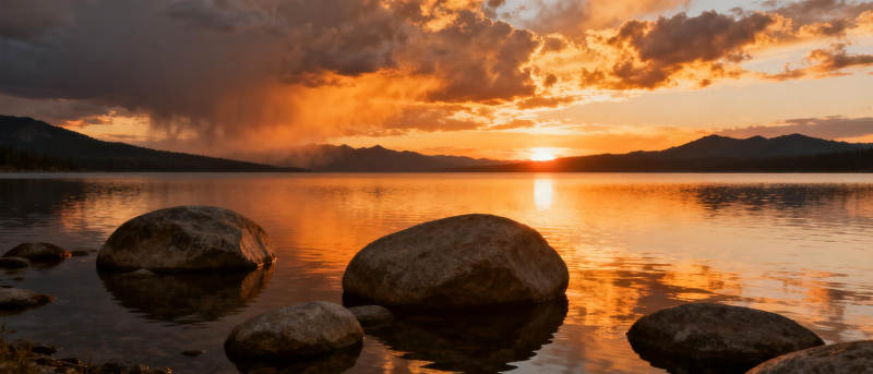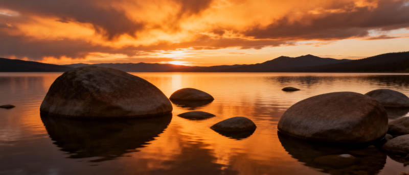 湖畔夕阳映石影