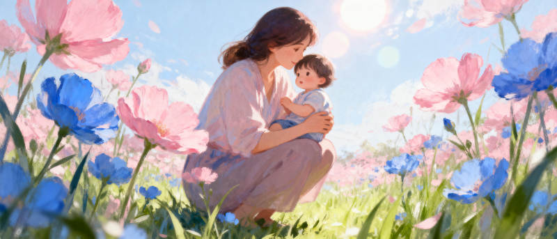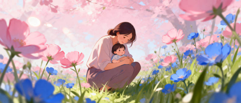 春日母子花间憩