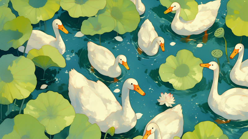 荷塘白鸭戏水