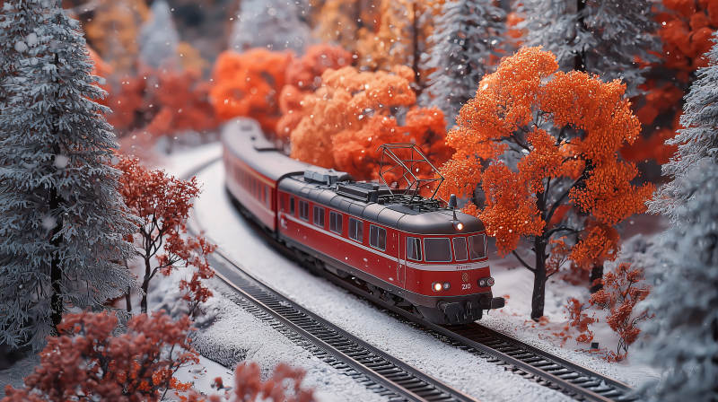 秋雪中的红色列车