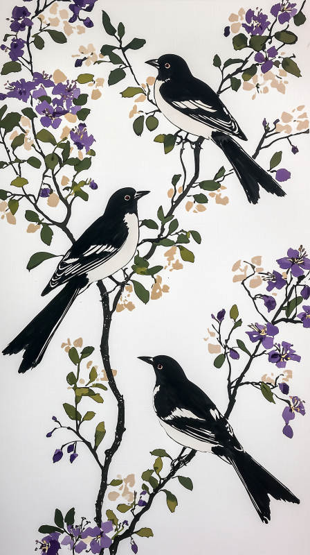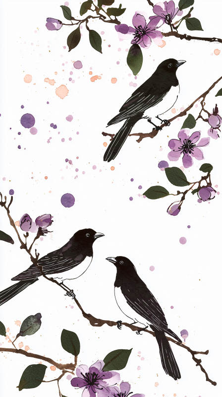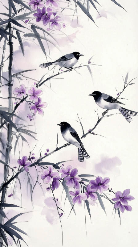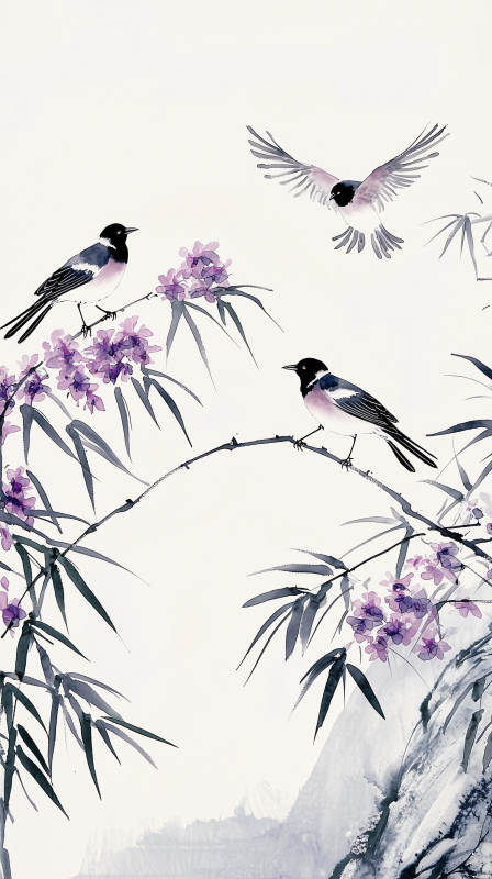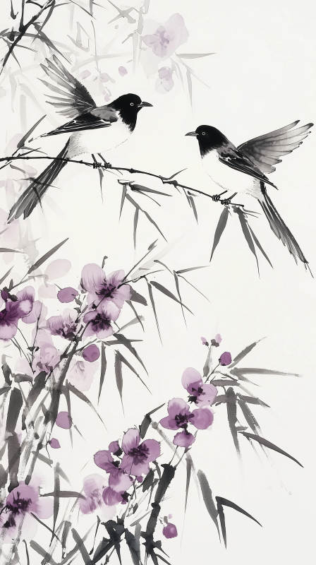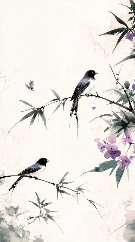黑白水墨鸟与花枝
