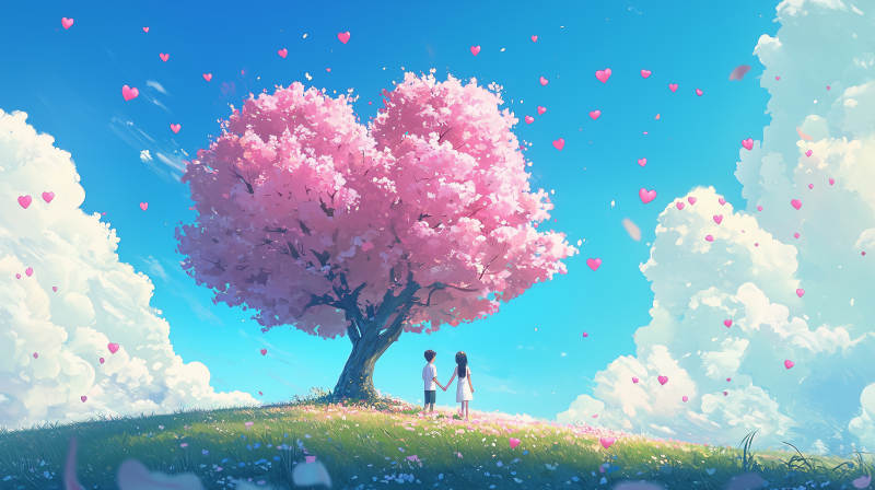 爱心樱花树下的恋人