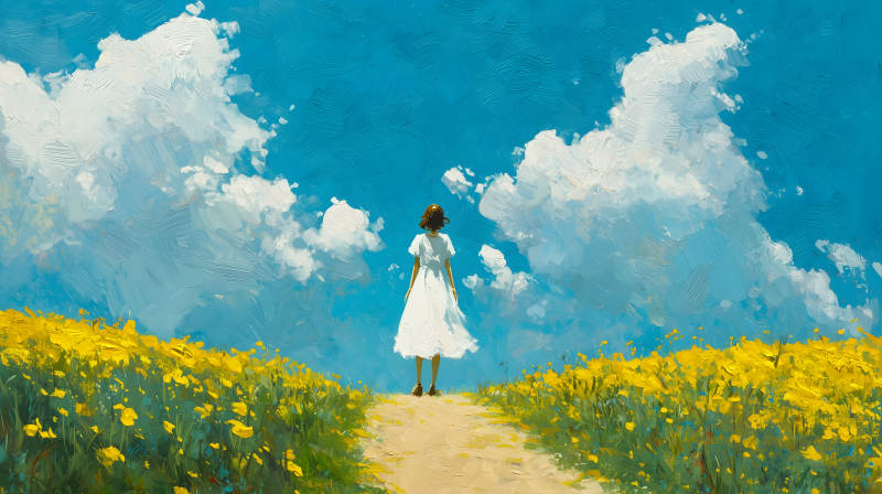 女孩背立小路油菜花香醉蓝天