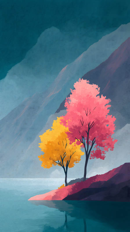 湖畔粉树风景画