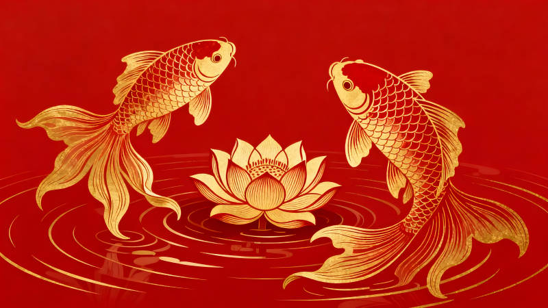 金色鲤鱼与莲花在红水中游动