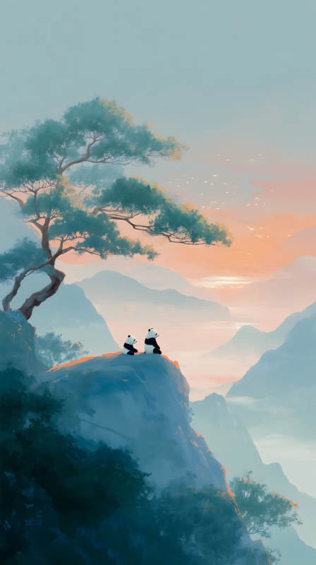 山顶日出时分两只熊猫