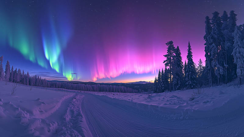 极光下的雪山公路