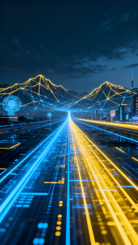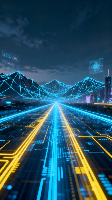 赛博朋克风格城市道路与山脉