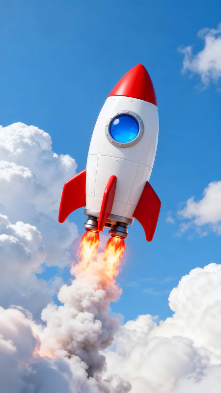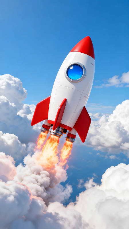 卡通火箭冲向蓝天白云