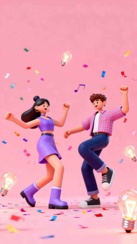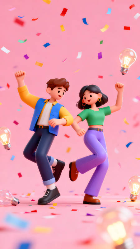 卡通人物跳舞庆祝创意灯泡彩色纸屑