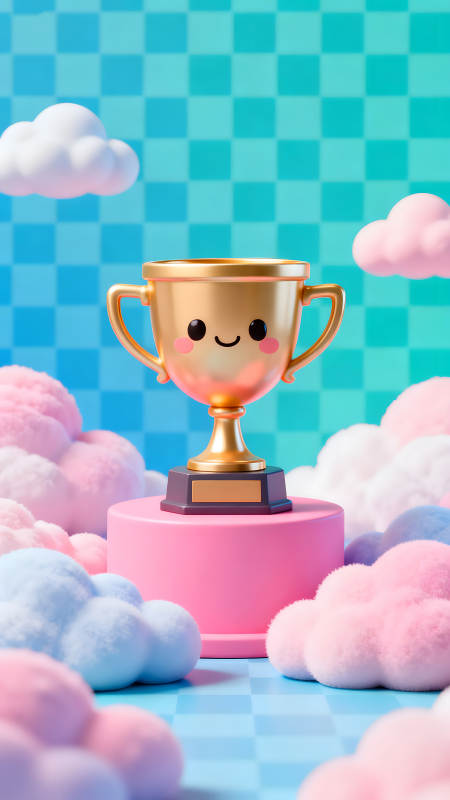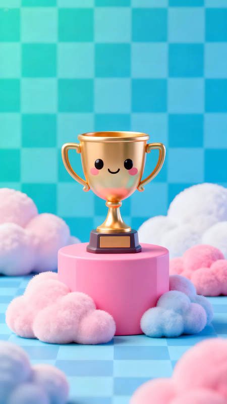 金奖杯放粉色底座上搭配可爱云朵背景